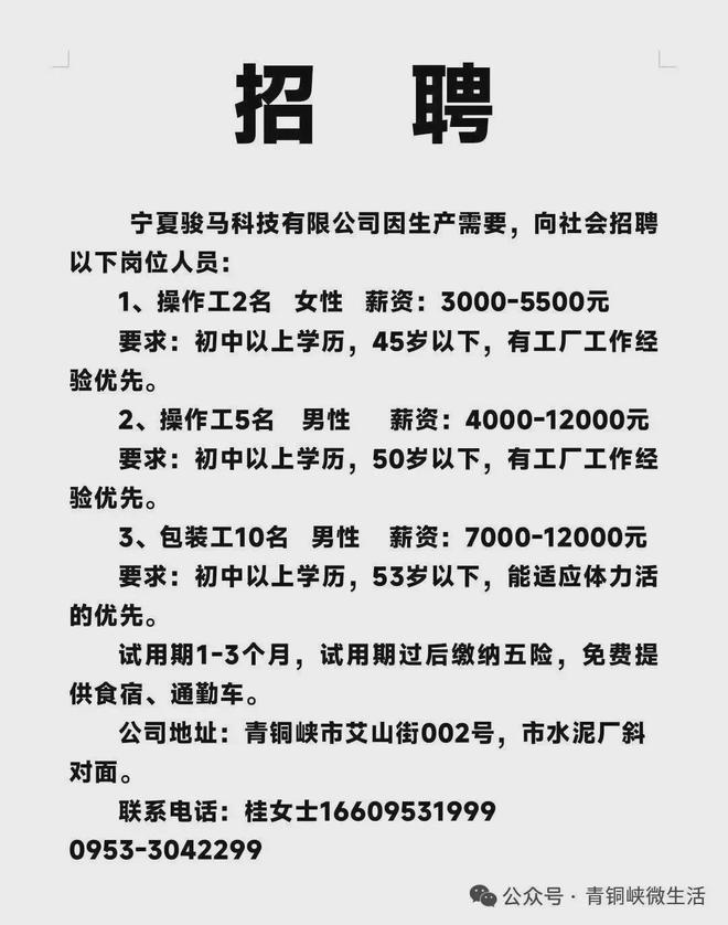 【招聘】康龙洗涤招聘:长期男工一名!年龄35-50岁!长白班!工资:(4500-6500):(基本+岗位+工龄+绩效+全勤+养老保险)。地址:青铜峡市嘉宝工业园区金环轴承厂院内。联系电话: