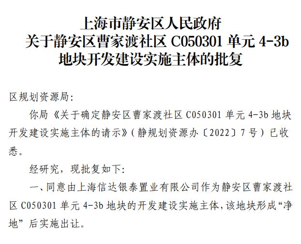 2022年6月,静安区人民政府官宣了曹家渡社区C050301单元4-3b地块的出让公告。