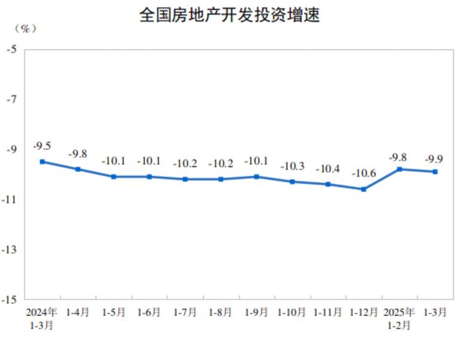 具体来看,房地产开发投资方面,增速降幅仍保持在一位数水平。数据显示,1-3月份,全国房地产开发投资19904亿元,同比下降9.9%;其中住宅投资15133亿元,下降9.0%。