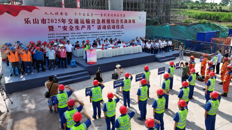 5月29日上午,乐山市交通运输局联合井研县人民政府、中铁广州局集团有限公司,在资乐高速项目TJ5标段井研东枢纽组织开展乐山市2025年交通运输应急救援综合实战演练暨安全生产月启动仪式。此次活动旨在强化全市交通运输行业安全生产意识,提升应急救援实战能力,筑牢交通运输安全防线。